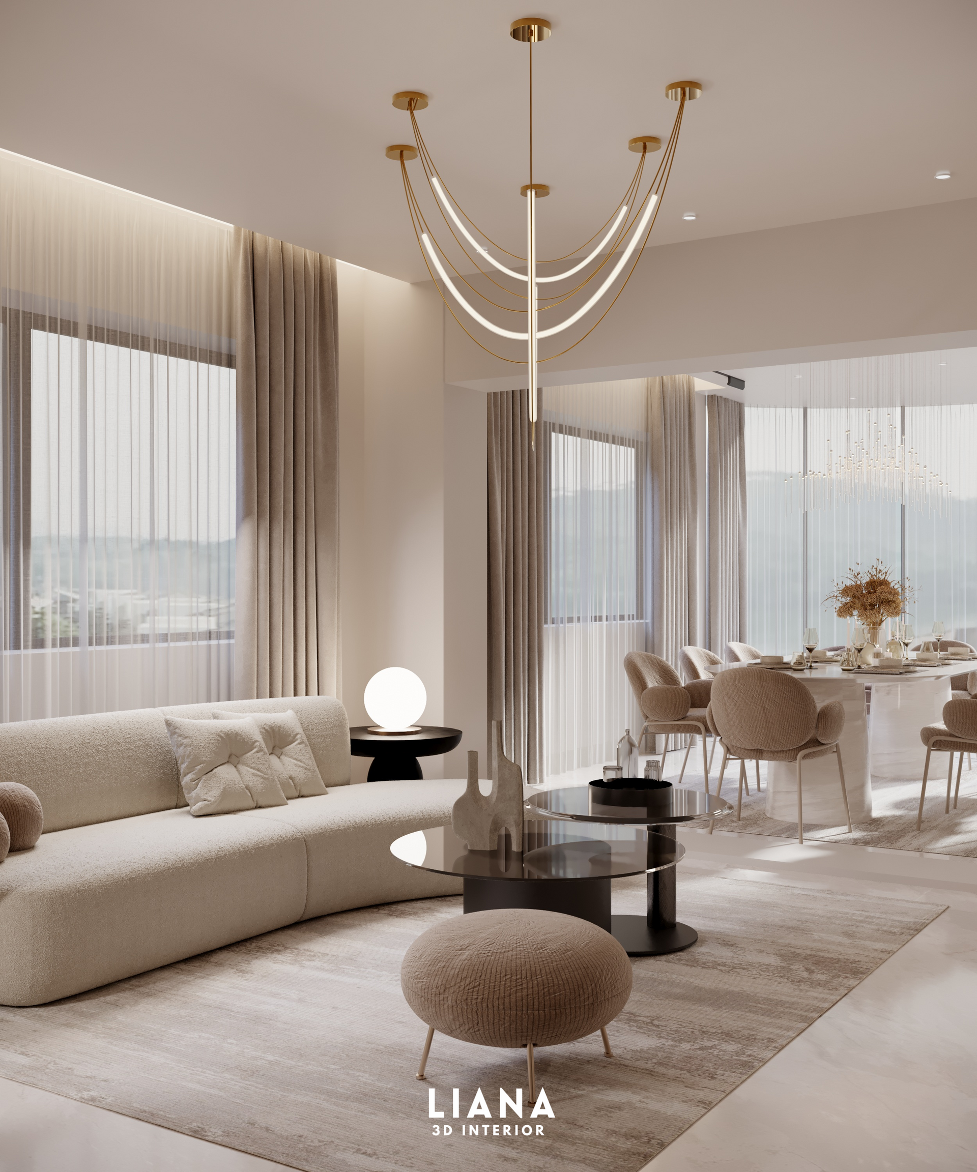 Elegant living room with cream-colored curved sofa, round ottoman, dining table, and modern chandelier. Architecture Visualization, Interior Design 3D