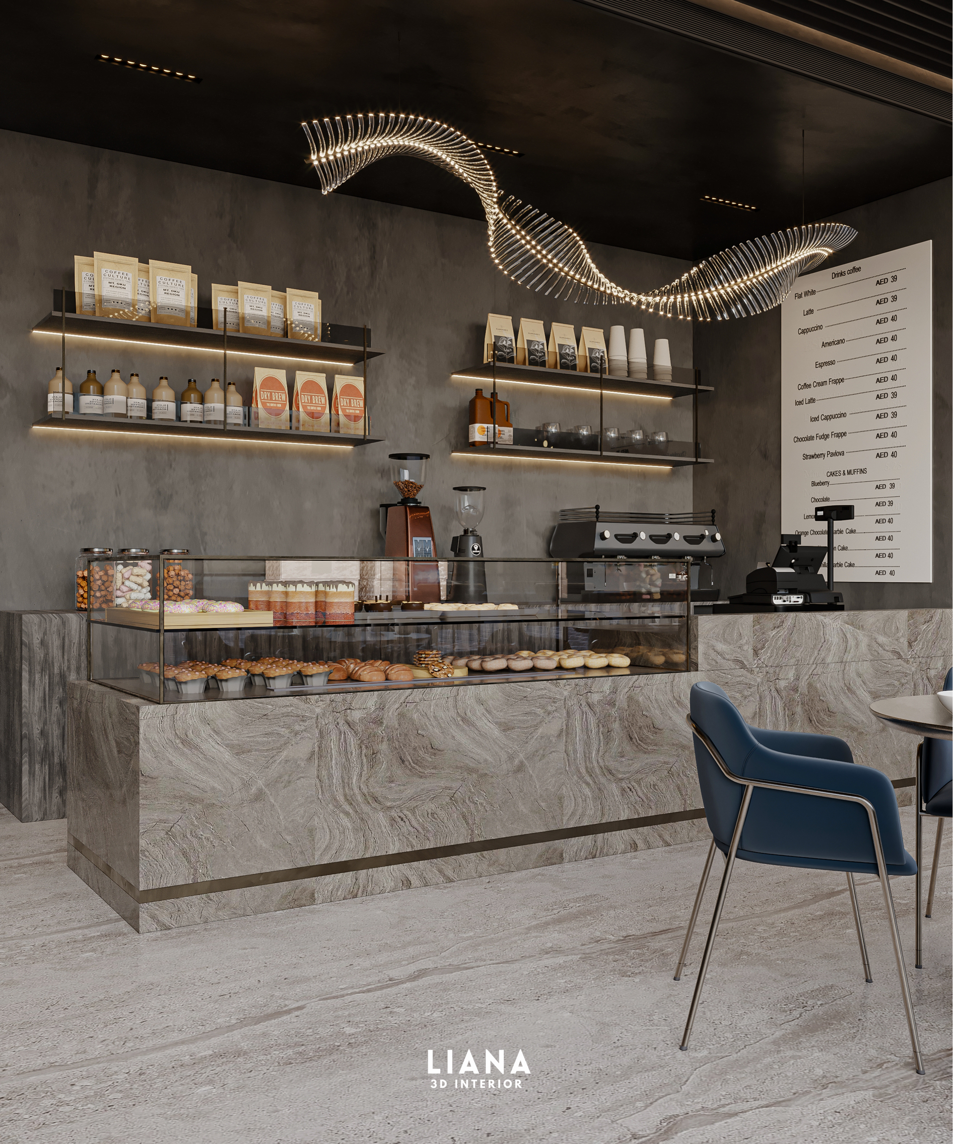 Modern cafe interior with marble counter, shelves of products, espresso machine, and a menu board.