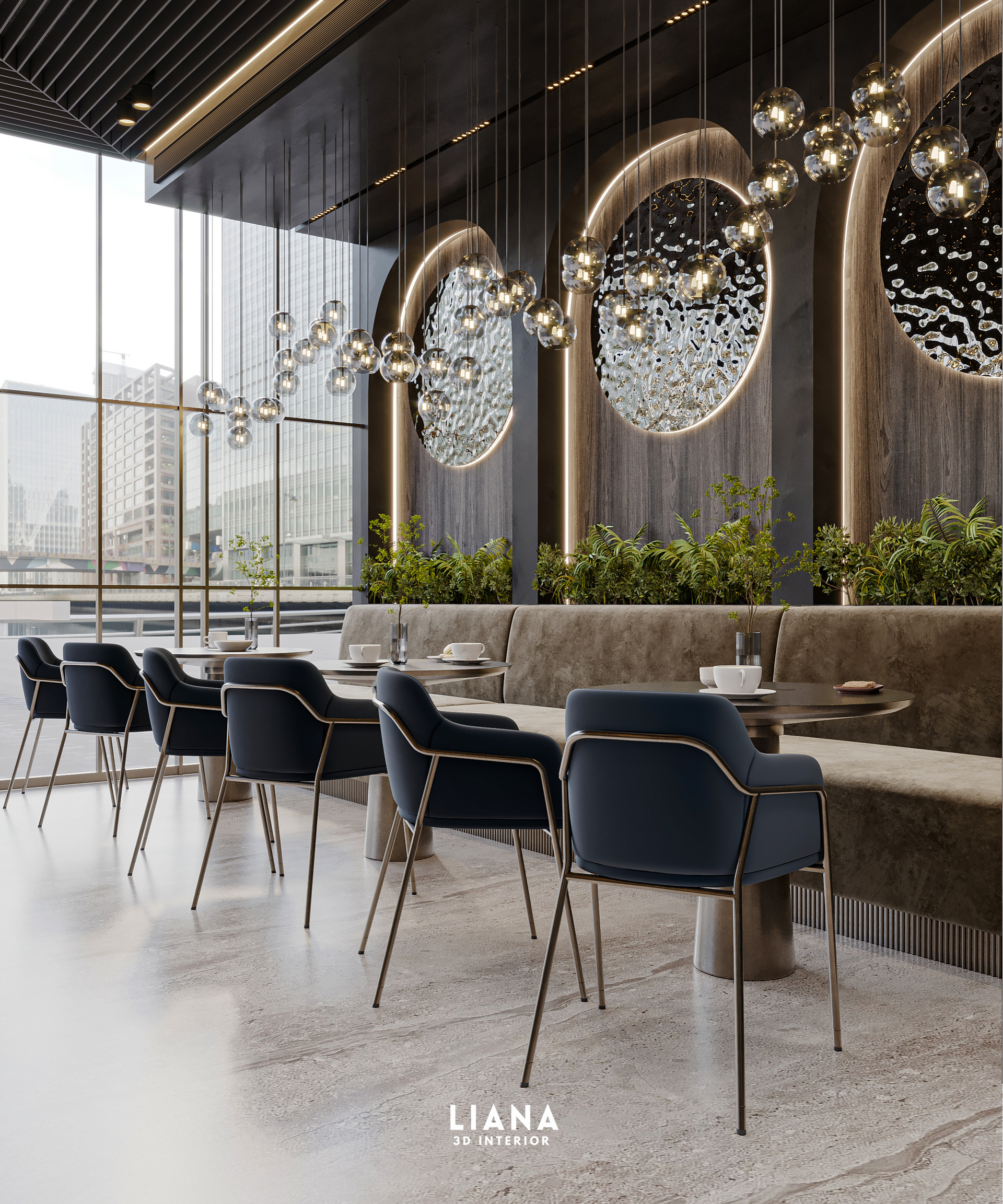 Stylish restaurant interior with dark walls, blue chairs, and decorative circular lights. Commercial Project Visual 3D Interior