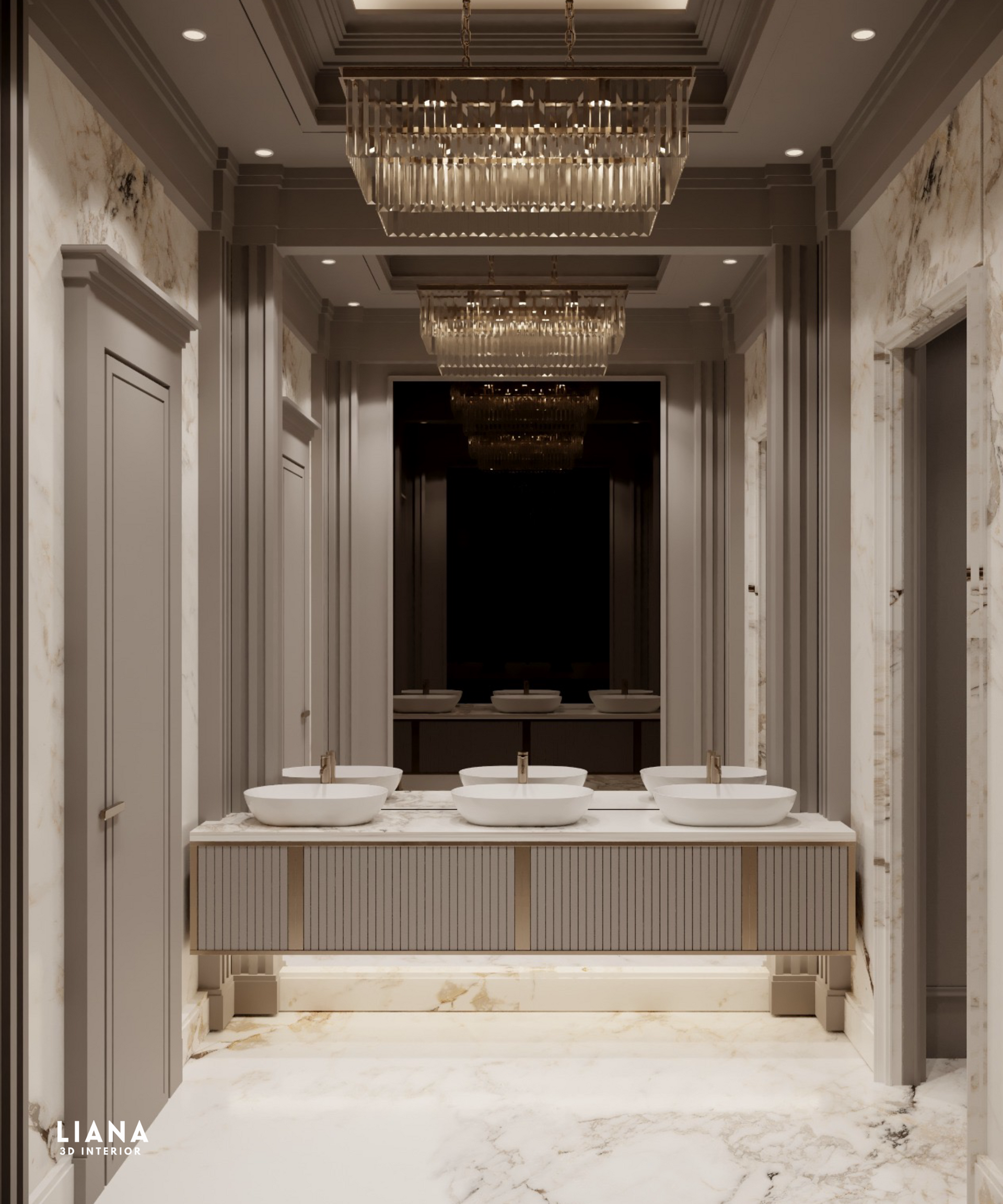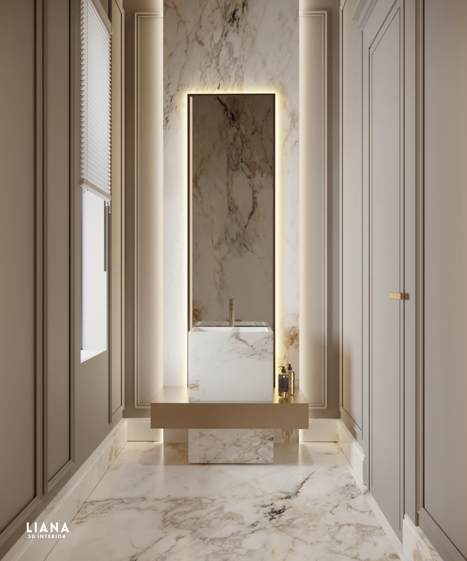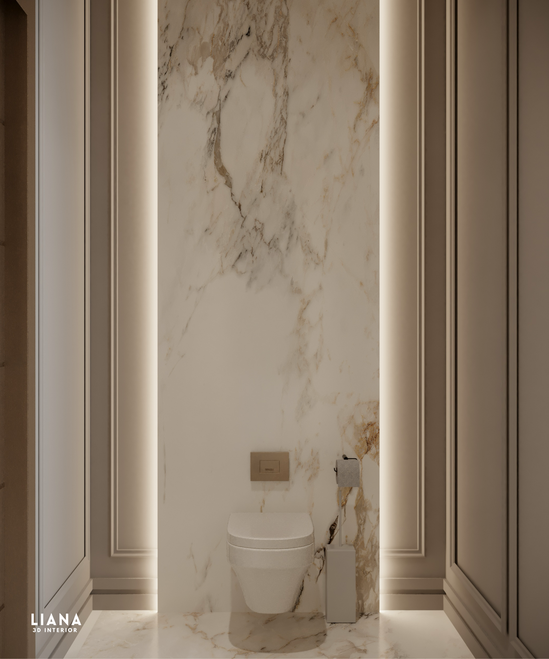 Luxurious bedroom with marble wall, platform bed, and neutral tones. 3D Interior Design and Visualization of Modern Bedroom