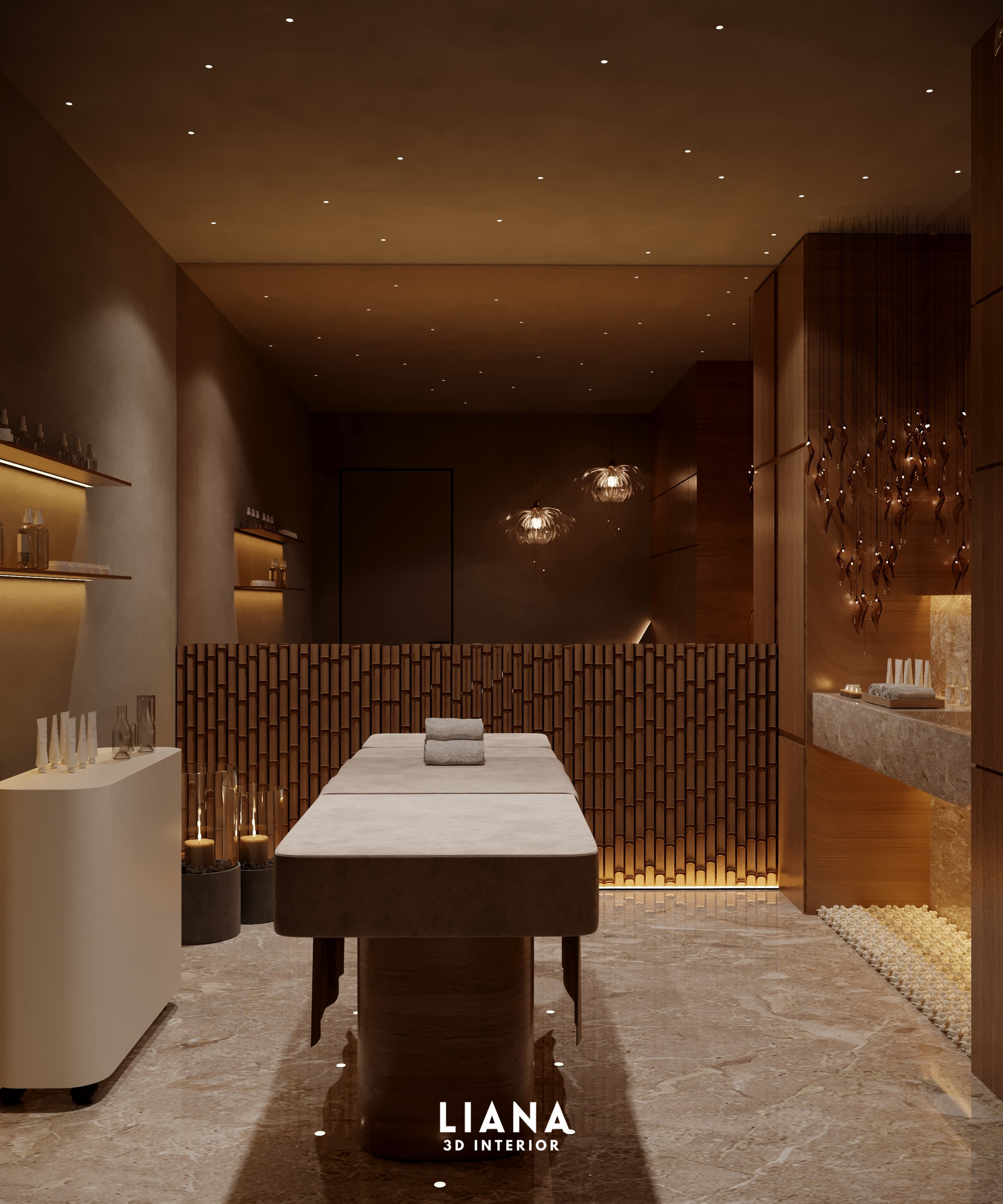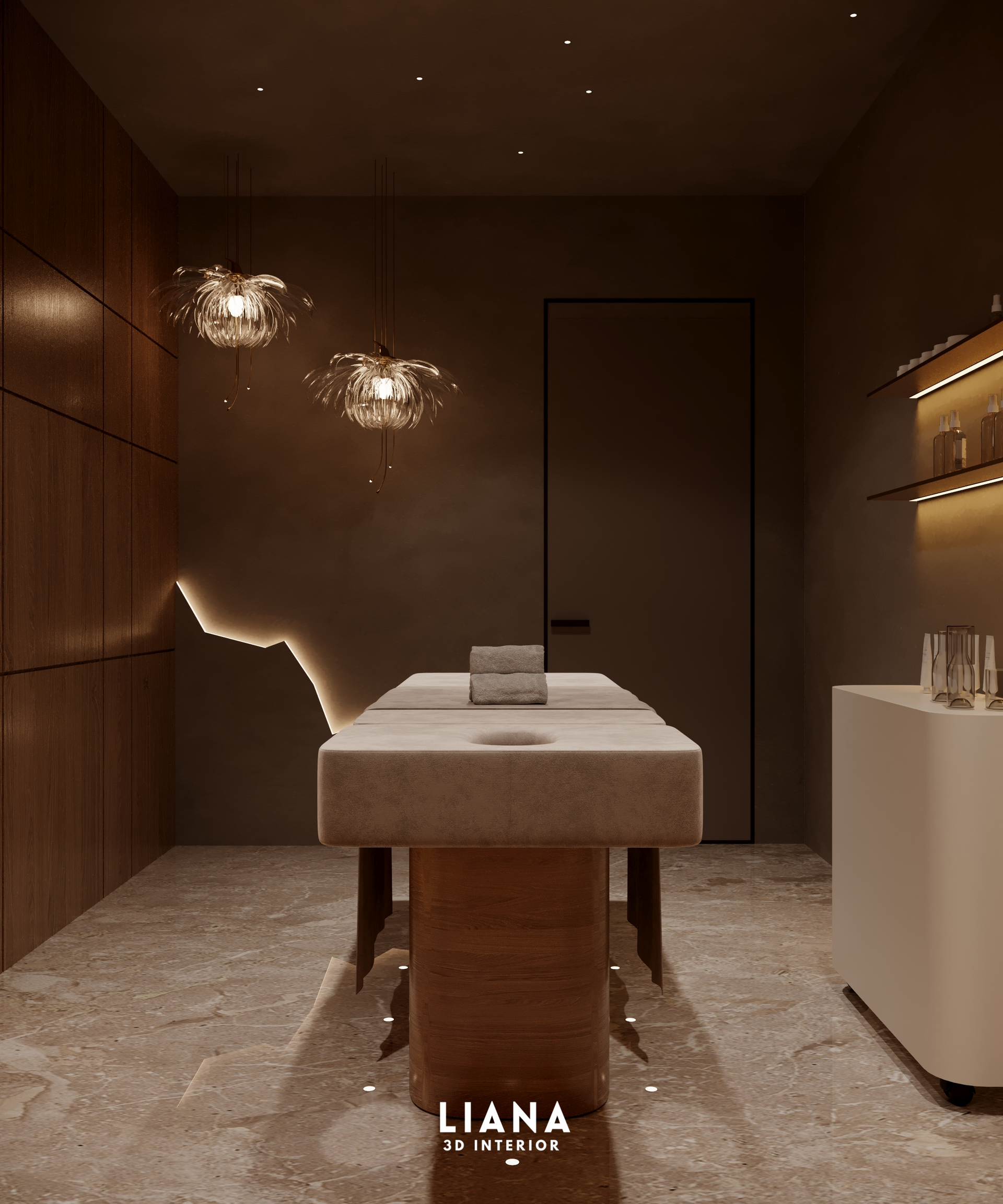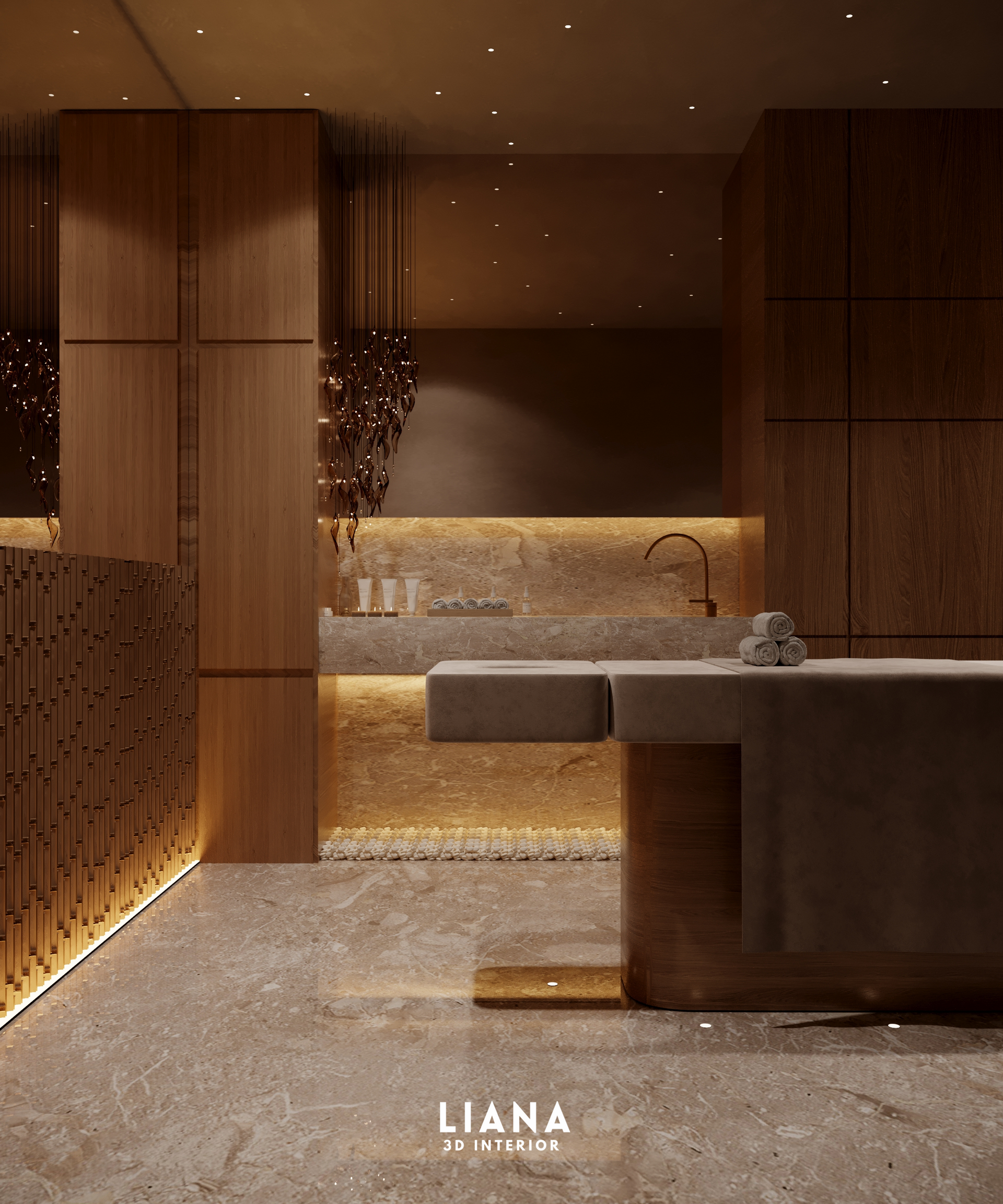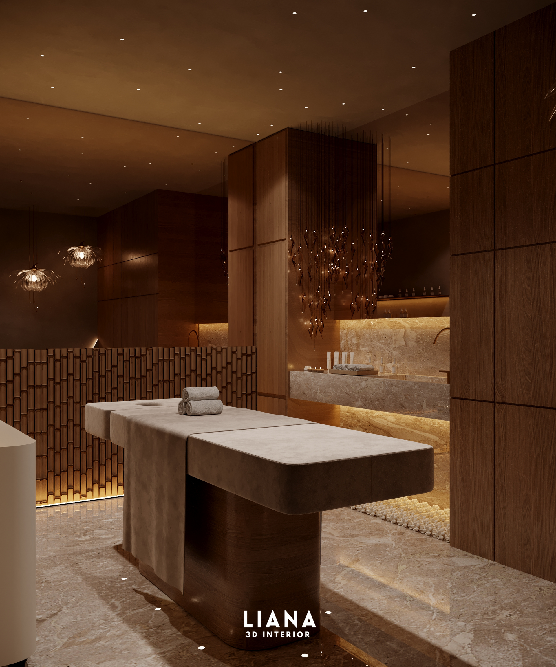 Modern outdoor seating area with lounge chairs, fire pit, and illuminated wall accents. Modern and Luxury Villa Exterior Design Visualization