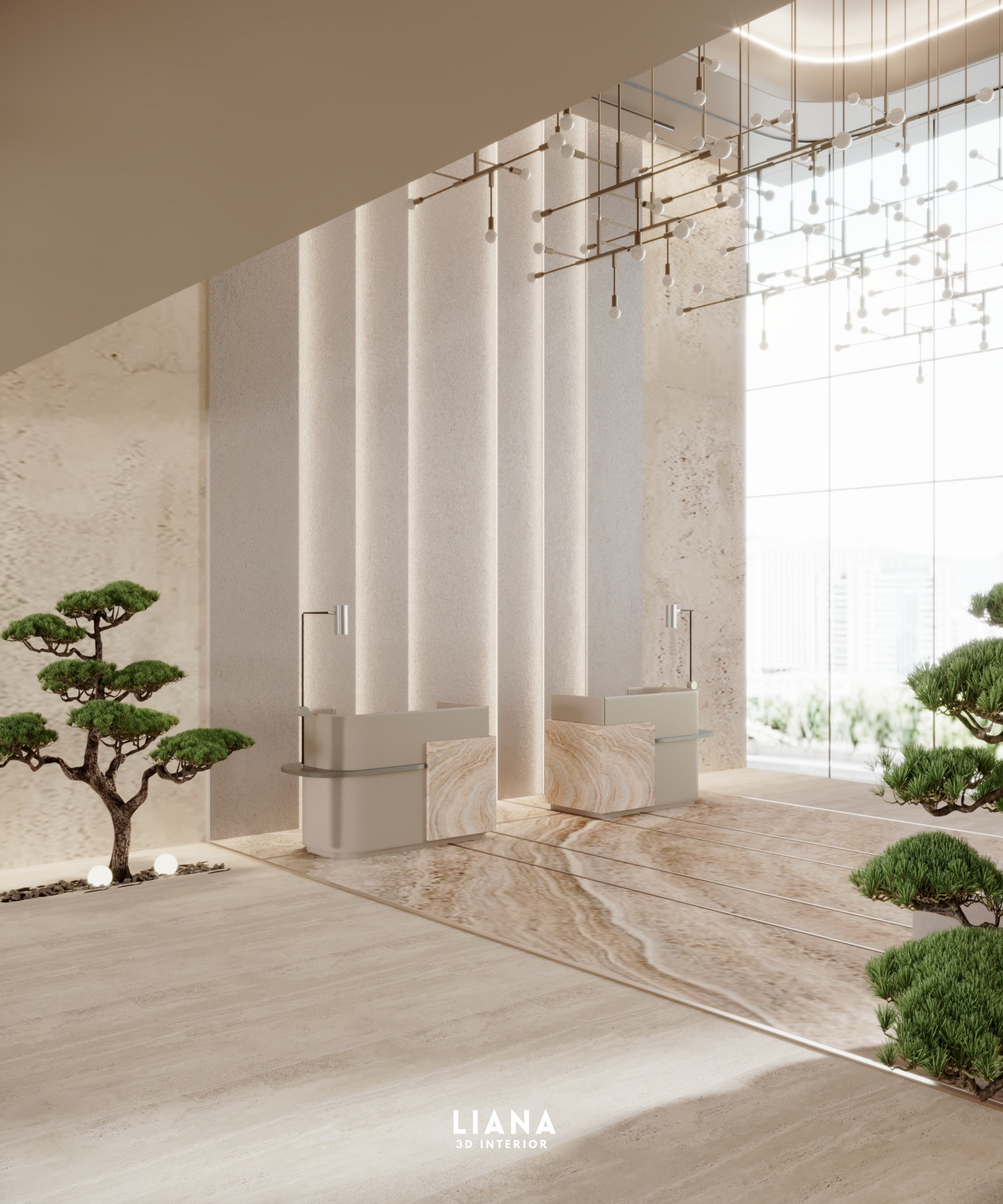Elegant lobby with light beige tones, curved sofa, modern chandelier, and a bonsai tree. Hotel Lobby Design 3D interior Visualization