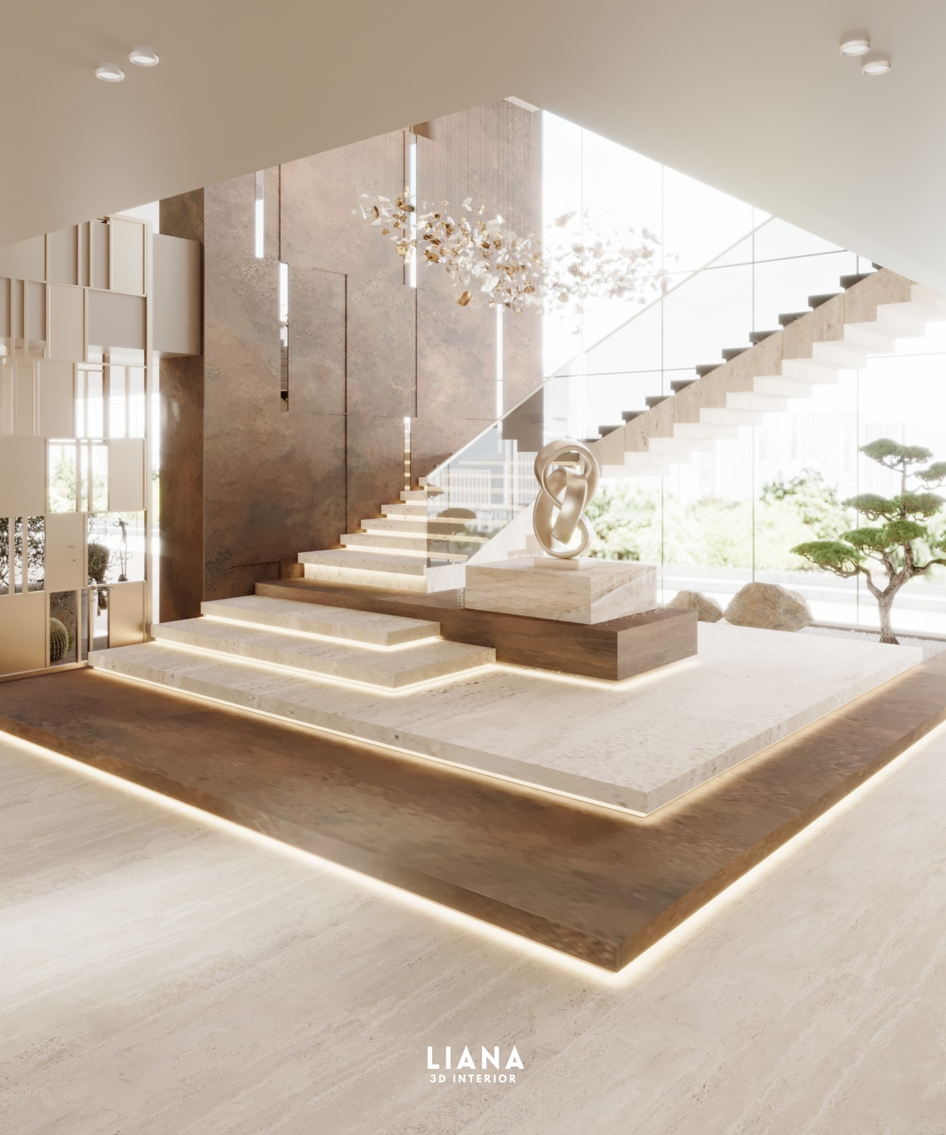 Elegant, light-filled interior with large chandelier, sculpture, neutral tones, and multiple levels.3D Interior Visualization